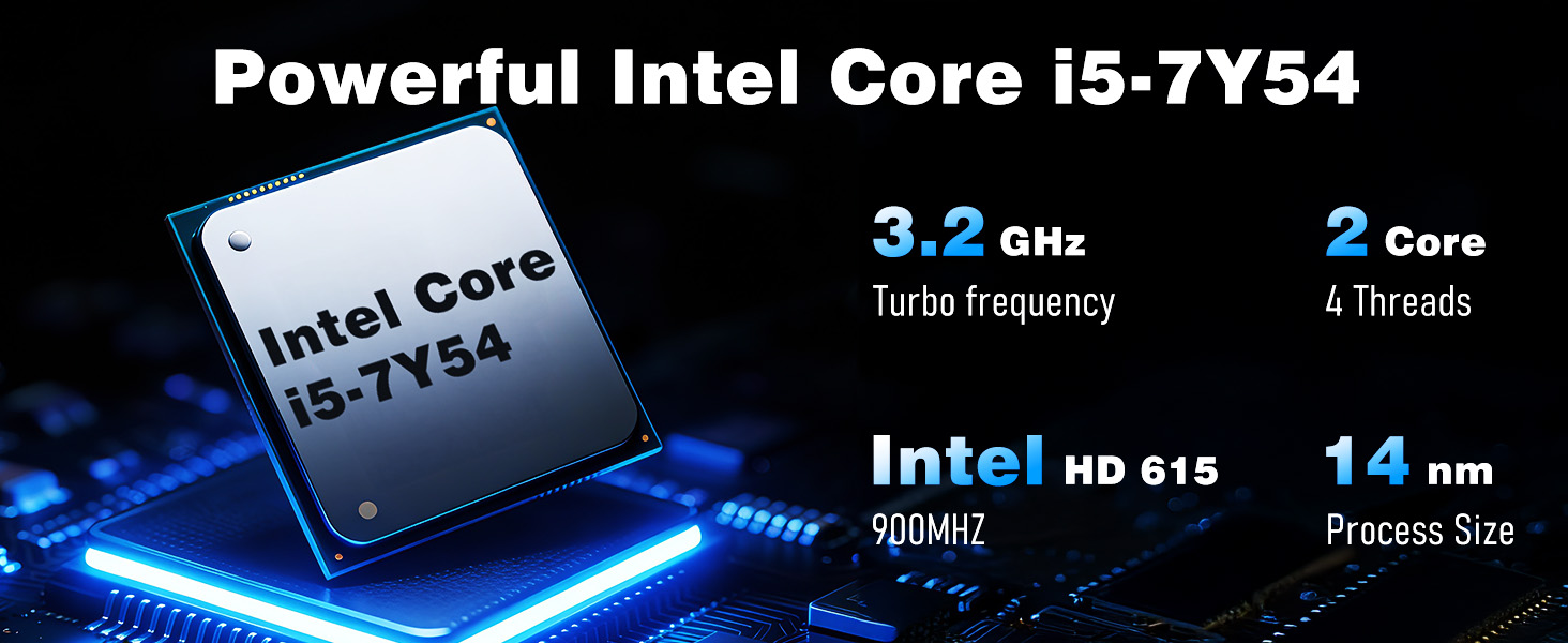 - 【Effortless Speed, Seamless Performance】Fueled by the i5-7Y54 processor boasting a maximum turbo frequency of 3.2GHz, its 7W low-power design ensures whisper-quiet operation and efficient heat dissipation. Featuring a dual-core, quad-thread architecture, it handles everyday tasks—from web browsing to document editing—with smooth, lag-free performance.
